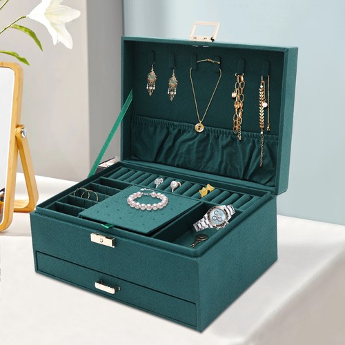 - Three-layer Dark Green Jewelry Storage Box, Flannel Material. It Can Store Accessories Such As Earrings, Earrings, Necklaces, Bracelets, Ring Brooches and Watches. High-quality Hardware Lock Durable and Not Easy to Break, Easy to Open and Close. Earring Stud Storage Hole Neatly Arranged, Clear at a Glance Three-layer Design, Layered Different Types, Large Space